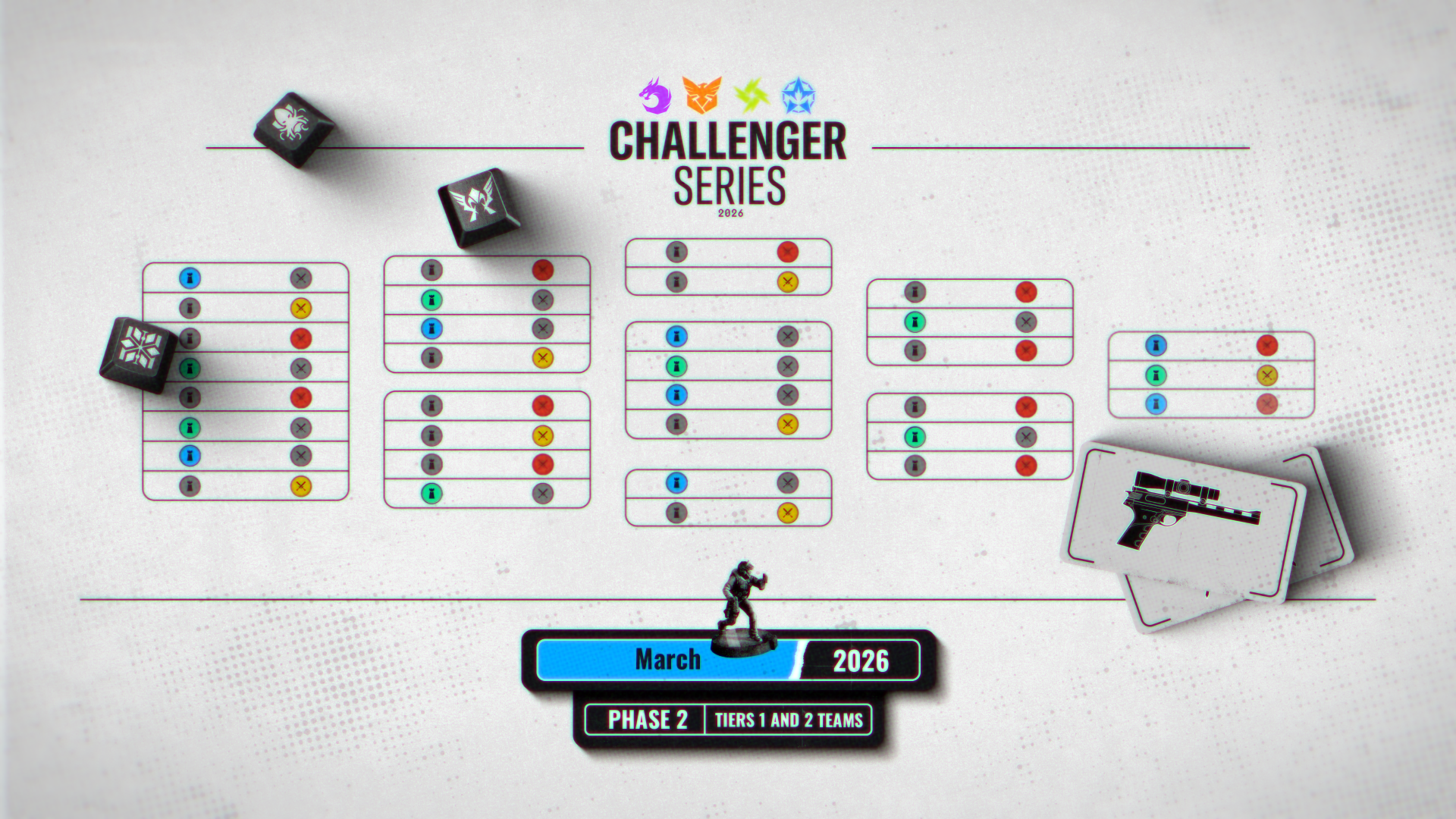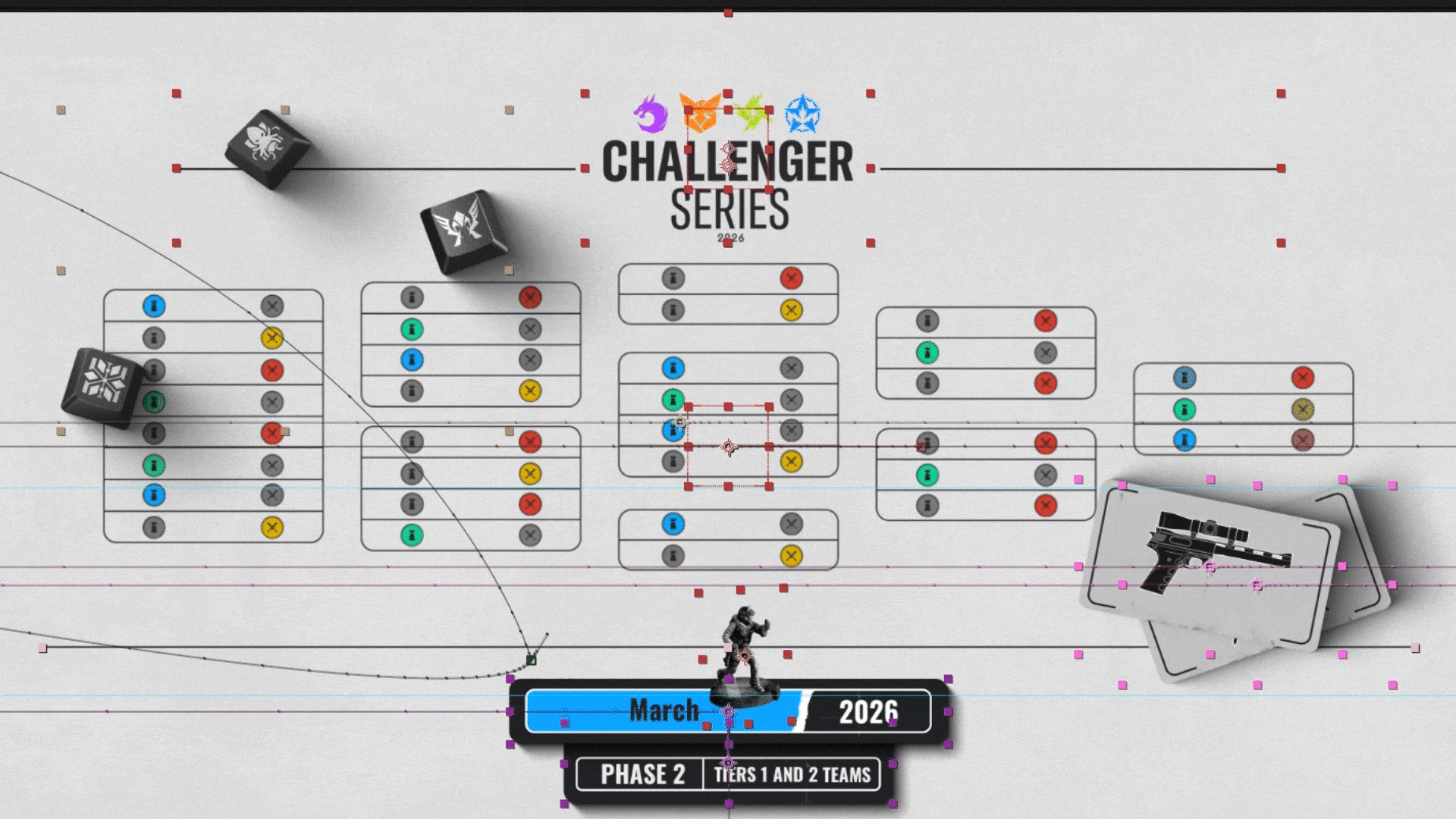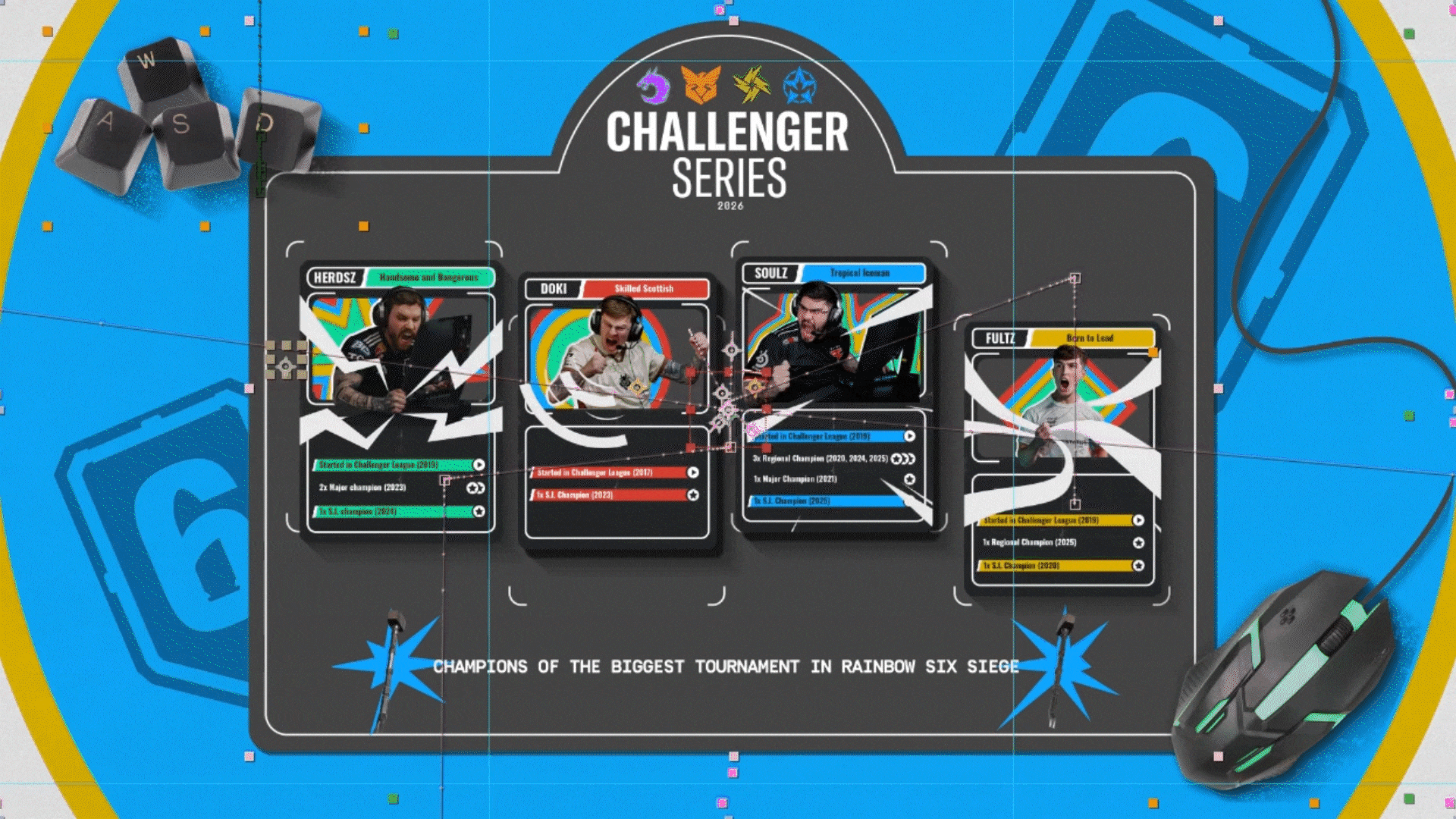 The design turns the Challenger Series journey into a board game, connecting the Rainbow Six Siege universe to the ideas of progression and strategy. Players are represented as game cards, while in-game elements help build a clear and intuitive visual system, strengthening